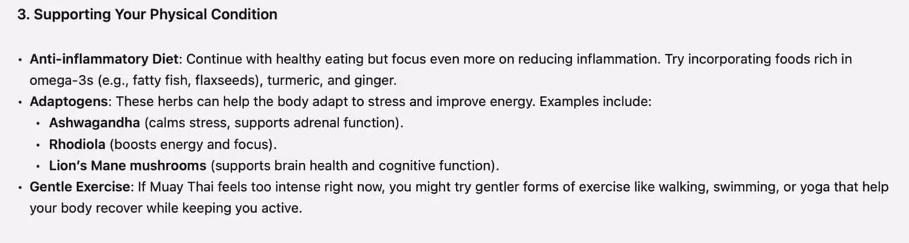 GPT remembers I train Muay Thai, an intense and violent martial art, and suggests I tone It down. It also remembers the extent of my diet and supplement intake.